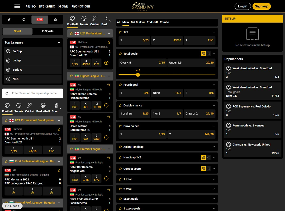 When writing this Grand Ivy review, our experts tested the sportsbook for the user experience. Overall, it’s similar to many other UK bookmakers. The sports are on the left, odds in the middle, and the betting slip on the right of the screen. On mainstream events expect hundreds of markets from handicaps and moneylines to special bets and over/under betting.