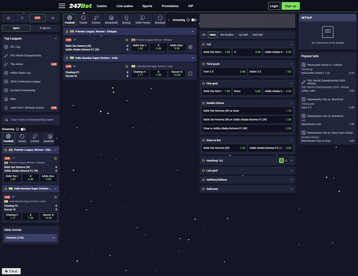Before writing this 247Bet online review, we tested the platform to determine the ease, speed, and general design. The theme is clear: a navy-blue background, white text and green buttons throughout. The layout is simple, so navigating to the sports you want to bet on is a breeze. Whether on a smartphone or PC, the speed is quick, which is ideal for live betting or requesting cashouts.