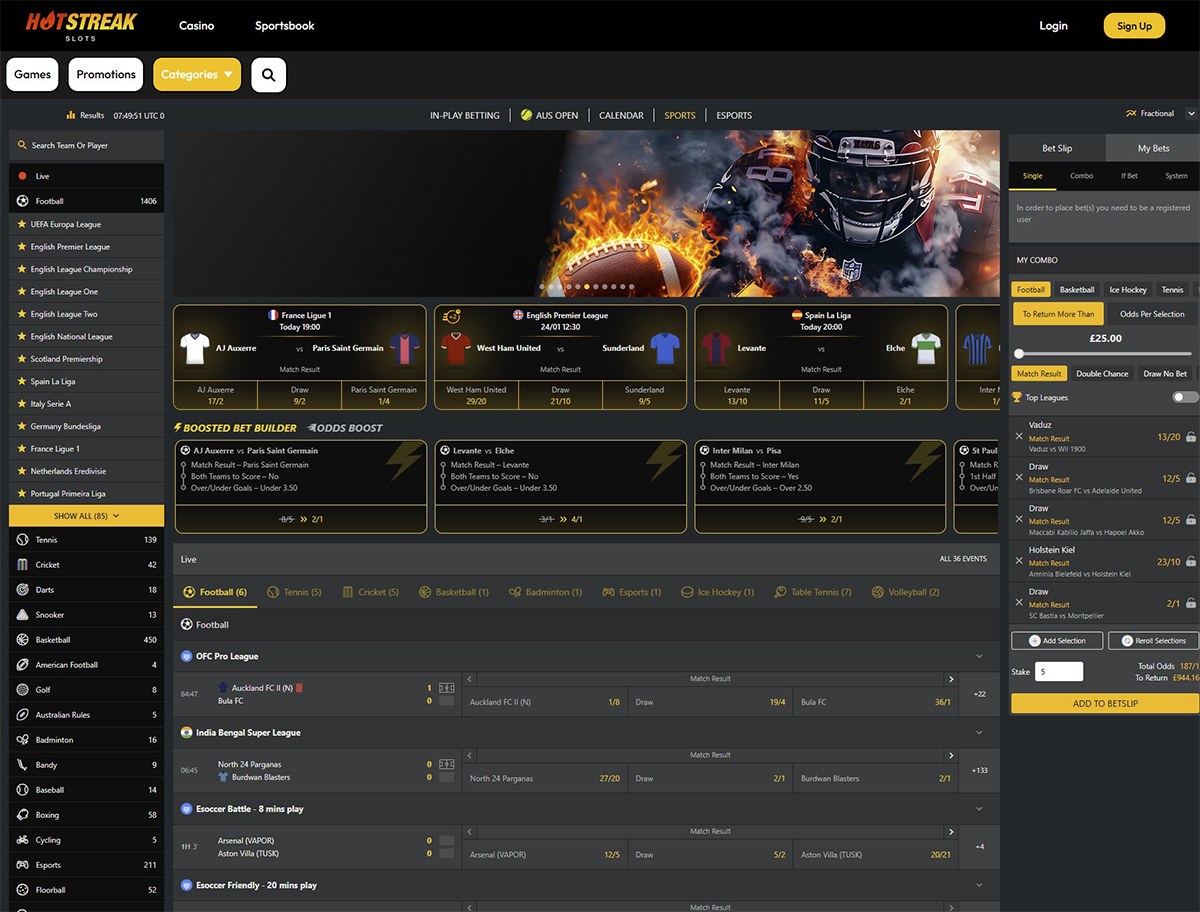 Compared to the top football betting sites in the UK, Hot Streak holds its own. This is because you’re able to bet on 999+ events at any time, pre-match and in-play. You can wager on top leagues too – like the Premier League, UEFA Champions League and the World Cup.