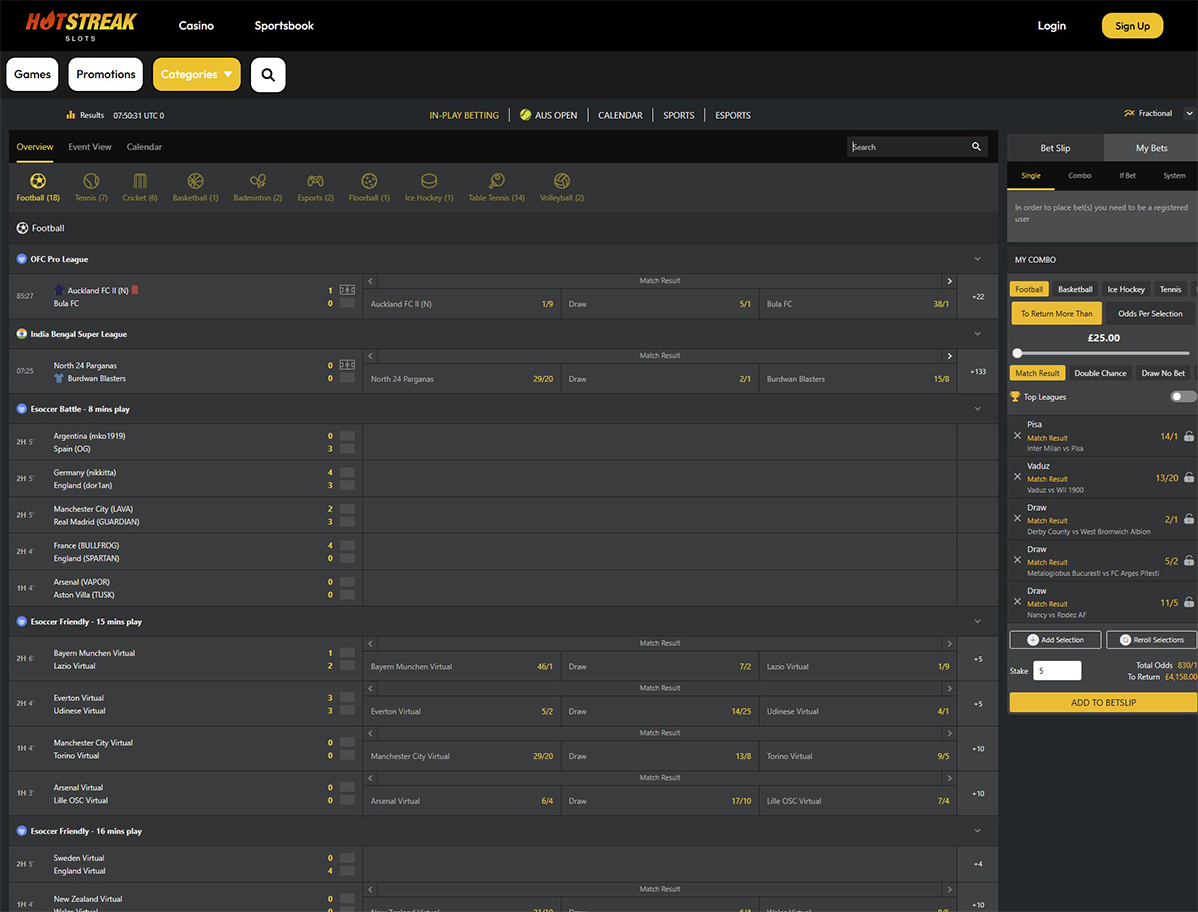 Compared to the best betting sites in the UK, Hot Streak odds are competitive as the whole sportsbook is around 94.6%. Football betting on average is about 95%, tennis sits at 94.8%, cricket 94.4%, rugby 95.2%, and horse racing 92.5%. In-play betting odds are less favourable than pre-event.
