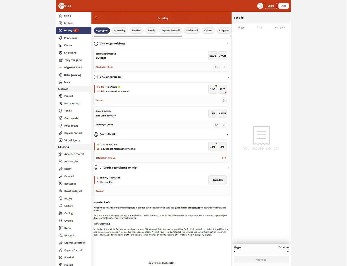Placing a bet on your favourite Virgin Bet sports is as easy as it gets. Firstly, you pick a sport from the vertical menu on the left-hand side of the website, let’s say badminton. Secondly, you can see a horizontal bar with all the matches and events, as well as outrights and specials. You compare the odds and select a certain bet, then you organise your bet slip. There is a visual interpretation in the boxes below.